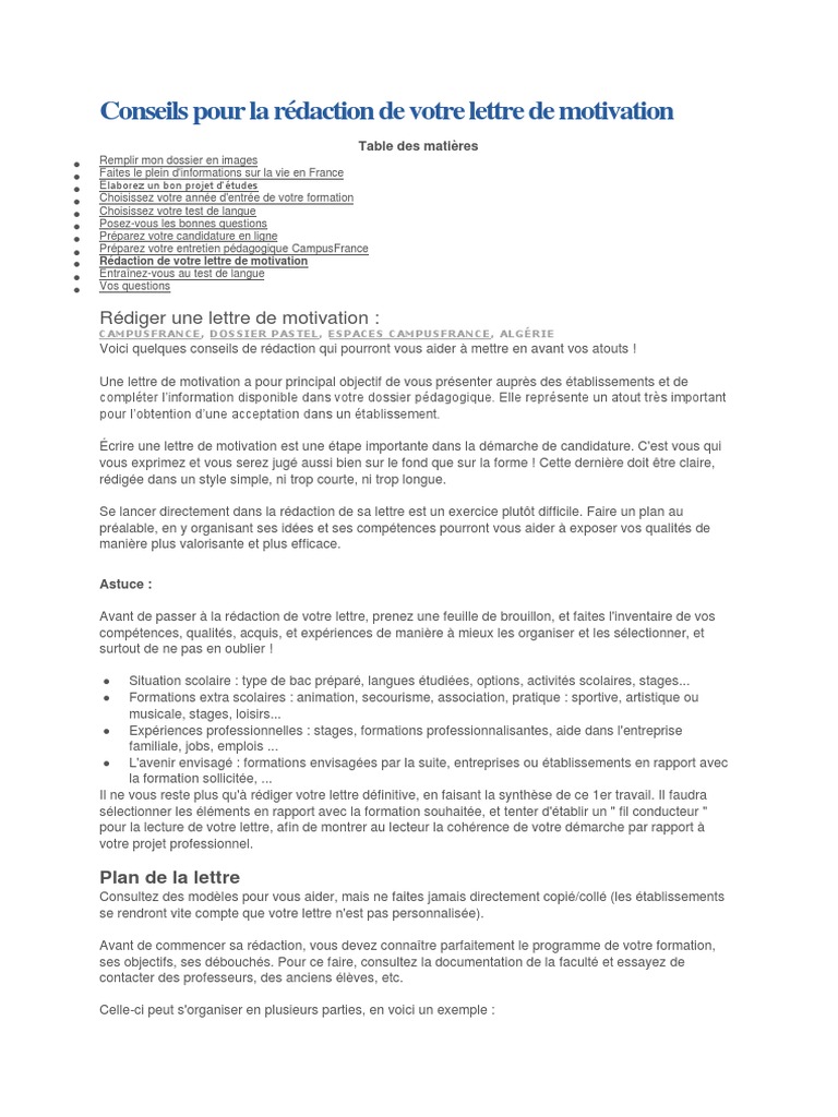 Exemple De Lettre De Motivation Campus France Algerie. Il est très facile de se faire aider pour la rédaction de la lettre de motivation, c’est ce que nous ferons d’ailleurs plus bas, mais il faut aussi faire attention à ne pas en faire trop. Lettre de motivation pour campus france algerie. Cela signifie que si l’étudiant présente dans son dossier un résultat de tcf en b1 ou b2, présenter une lettre écrite avec un français très. Quel modèle de lettre pour étudier dans une université française ? La lettre de motivation a pour but de donner les raisons qui vous poussent à choisir une formation. Aug 08, 2019 · campus france :